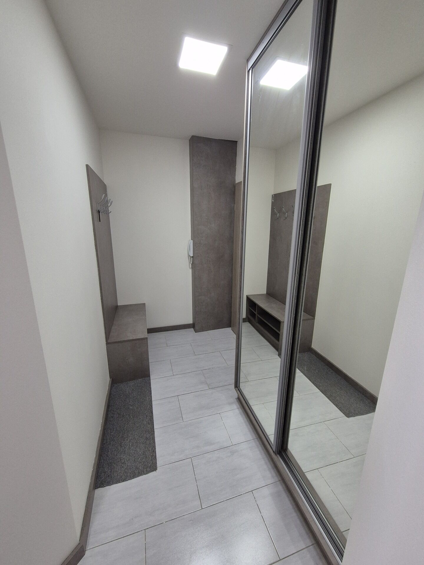 Dispozice bytu: kuchyňský kout (vybaven kuchyňskou linkou s vestavěnými spotřebiči - sklokeramickou varnou deskou, lednicí, digestoří, horkovzdušnou troubou, mikrovlnnou troubou), obývací pokoj (stolek, komoda, stůl, židle), ložnice (manželské dvoulůžko, skříně), předsíň (vestavěná skříň, botník), koupelna (koupelnová skříňka se zrcadlem, sprchový kout) a samostatné WC (skříňky, malé umyvadlo).